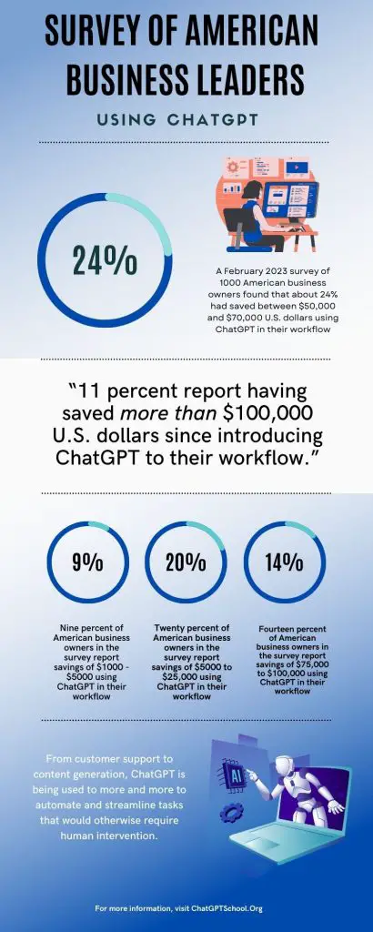 Approximately 24% of the organizations surveyed by American business executives in February 2023 reported that they had saved between $50,000 and $70,00 utilizing ChatGPT in their workflow.